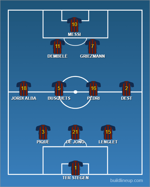 Barcellona (3-4-3): Ter Stegen; Piquè (Mingueza), de Jong, Lenglet; Dest, Busquets, Pedri, Jordi Alba; Messi, Dembélé, Griezmann.