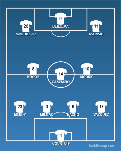 Real Madrid (4-3-3): Courtois; Lucas, Nacho, Militao, Mendy; Modric, Casemiro, Kroos; Asensio, Benzema, Vinicius.