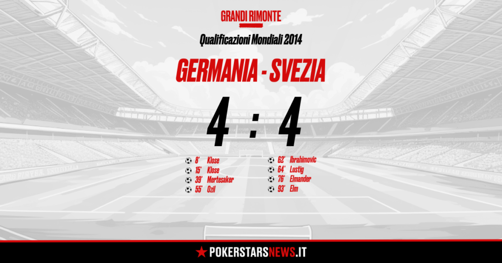 È la notte del 16 ottobre del 2012 e, in Italia, la Juve ha appena vinto il suo primo scudetto (dei 9 di fila), si gioca ancora con le Play-Station 3 e Del Piero si è appena ritirato. Quella notte nel girone C, delle qualificazioni al “Mondiale dei Mondiali” in Brasile, accadde davvero l’impossibile tra Germania e Svezia.