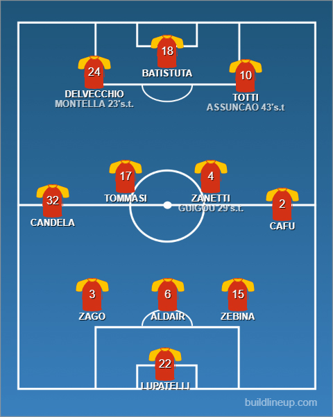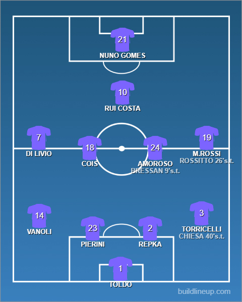 Lupatelli e Aldair prendono il posto di Antonioli infortunato e Samuel squalificato – strano, direte voi. Batistuta va sotto il settore dei tifosi fiorentini, giunti in discreto numero per rivedere, anche se da lontano e con la morte nel cuore, il loro ultimo pupillo. Un’unica punta, al posto del 9 argentino, per la formazione allenata da Fatih Terim: trattasi di Nuno Gomes.