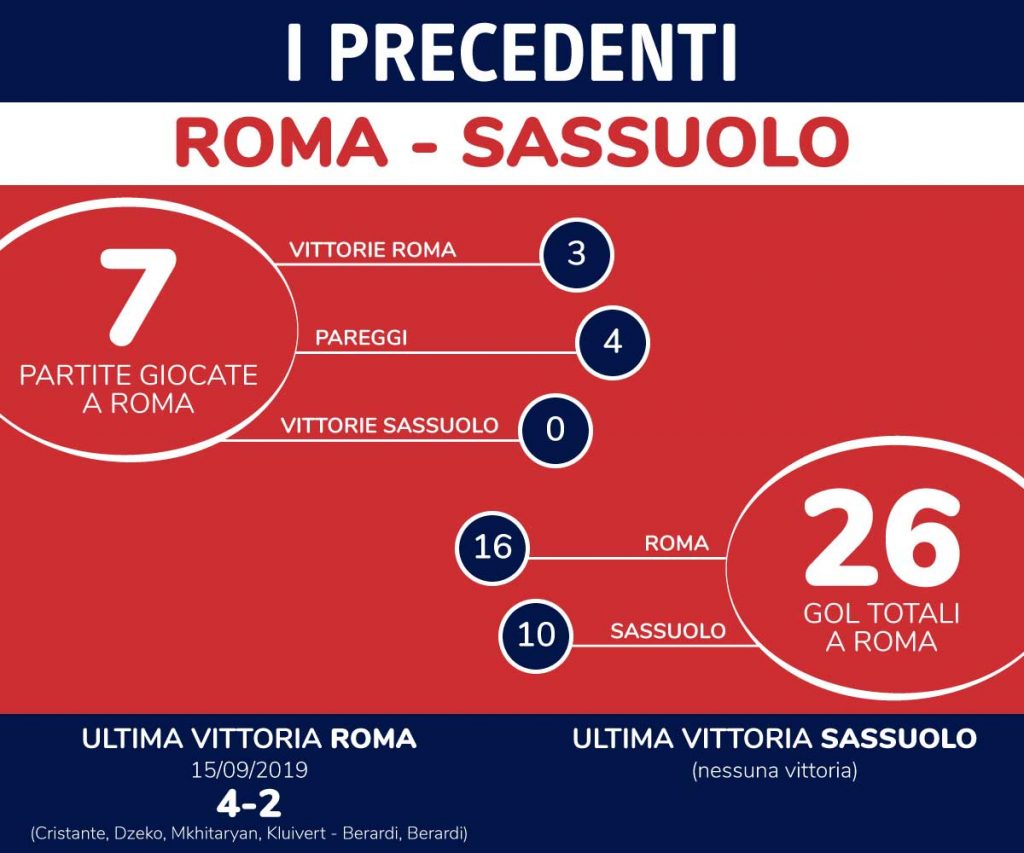 Nell’ultimo confronto tra le due squadre giocato a Roma, il 15 settembre 2019, i capitolini hanno avuto la meglio per 4-2, dopo un primo tempo travolgente in cui sono andati a segno con Bryan CristanteEdin DzekoHenrikh Mkhitaryan e Justin Kluivert (e con ben 3 assist di Lorenzo Pellegrini), prima che nel secondo tempo il Sassuolo tentasse una rimonta che però si è limitata alla doppietta di Domenico Berardi
