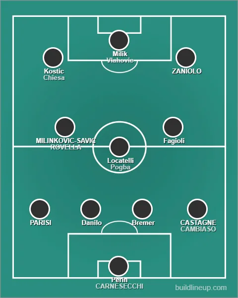 4-3-3: Perin; CASTAGNE, Danilo, Bremer, PARISI; Fagioli, Locatelli, MILINKOVIC-SAVIC; ZANIOLO, Milik, Kostic.