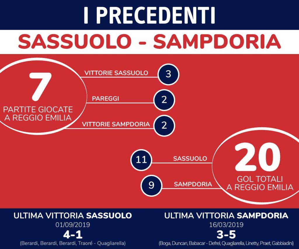 Anche l’ultima vittoria del Sassuolo, il 1° settembre 2019, ha visto molti gol, ma quasi tutti di marca neroverde: finì infatti 4-1 con tripletta di Domenico Berardi (7 reti in carriera contro la Samp) e gol di Hamed Junior Traorè, con l’inutile marcatura per la Sampdoria, in 10 per tutto il secondo tempo a causa dell’espulsione di Ronaldo Vieira, messa a segno su rigore da Fabio Quagliarella.