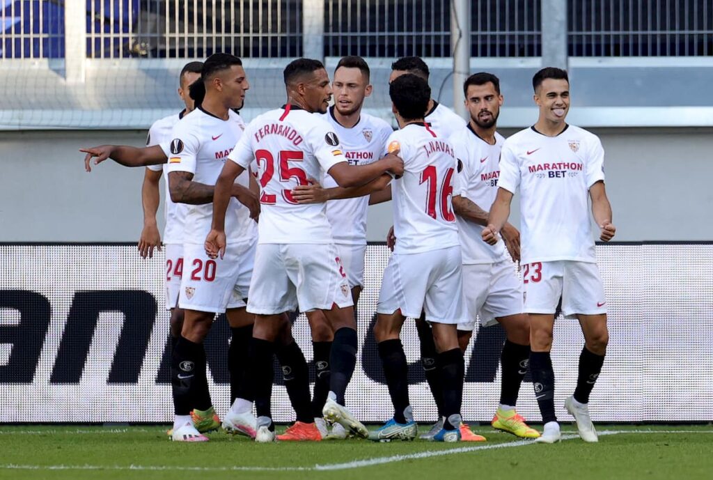 Gli spagnoli partono subito forte e ad avvio match al 6’, con uno splendido tiro dell’argentino Ocampos, sfiorano la rete del vantaggio. Prodezza di Pau López che devia in calcio d’angolo ed evita il gol. Passano soltanto sei minuti e al 12’, sugli sviluppi di un calcio d’angolo, Kounde con uno splendido stacco di testa sfiora il gol. La traversa dice no al francese, ma l’avvio della Roma è pessimo. Il gol per gli spagnoli sembra essere nell’aria, e al 21’ arriva: bel numero di Banega, che con uno splendido cambio di gioco col sinistro lancia e manda in porta Reguilon, che a tu per tu con il portiere giallorosso infila il gol sotto le gambe dell’estremo difensore della Roma. Tiro non inarrestabile, facilitato da una chiara complicità di Pau López. Passano i minuti ma non cambia lo spartito della gara: Siviglia che gioca in ampiezza e Roma che fatica a trovare le misure giuste. Al 30’ altra grande