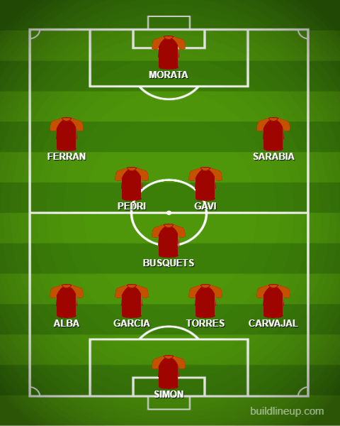 - (4-3-3): Unai Simon; Carvajal, Eric Garcia, Pau Torres, Jordi Alba; Gavi, Busquets, Pedri; Sarabia, Morata, Ferran Torres