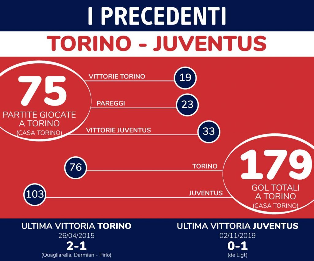 Dal 2002 ad oggi, la Juventus ha colto solo vittorie, eccezion fatta per il precedente dell’aprile 2015, quando fu il Toro a prevalere per 2-1: in quella occasione vantaggio di Pirlo e ribaltamento firmato da Darmian e Quagliarella.