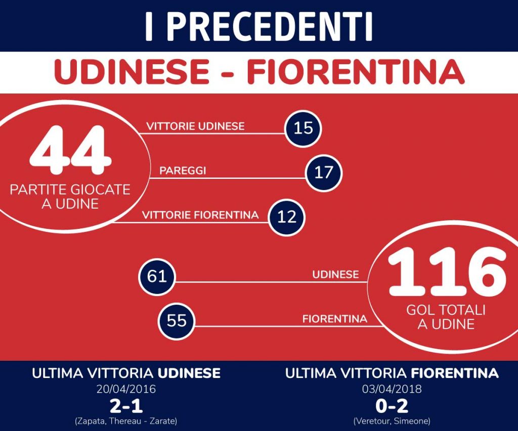 Sono 44 i precedenti in Serie A disputati in Friuli tra Udinese e Fiorentina. Quella tra la compagine friulana contro quella toscana appare una sfida piuttosto in equilibrio, dal momento che ad oggi le vittorie di casa sono 15, con 17 pareggi e 12 vittorie esterne.