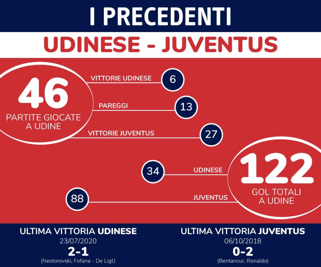 Dal 1950 ad oggi, la Juventus ha fatto visita ai friulani in Serie A in 46 occasioni. La statistica è clamorosamente a favore della Juventus, che ha espugnato lo stadio Friuli (oggi “Dacia Arena”) in ben 27 occasioni, con 13 pareggi e sole 6 affermazioni casalinghe.