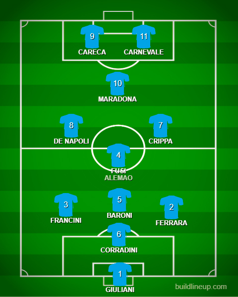 La formazione tipo: Giuliani, Ferrara, Francini, Crippa, Fusi (Alemao), Baroni, Corradini, De Napoli, Careca, Maradona, Carnevale.