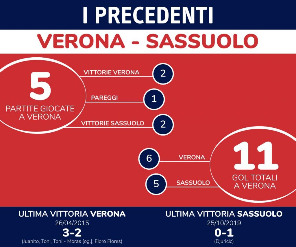 Il bilancio degli incontri di Serie A giocati a Verona è in perfetta parità al momento: 2 vittorie per gli scaligeri, un pareggio e 2 vittorie del Sassuolo.