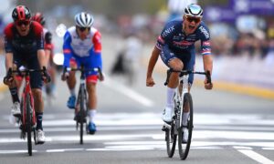 A Oudenaarde, sul lungo rettilineo d’arrivo, Van der Poel e lo sloveno hanno indugiato a lungo prima di lanciare lo sprint finale: l’olandese ha accelerato proprio quando, ai 250 metri, i due inseguitori Van Baarle e Madouas sono sopraggiunti di slancio e, a quel punto, Pogacar non ha più trovato spazio per la propria volata, trovandosi chiuso e dovendosi quindi accontentare della quarta piazza. Dylan Teuns e Fred Wright della Bahrain Victorius sono arrivati rispettivamente sesto e settimo, alle spalle anche dello svizzero Stefan Kung (Groupama – FDJ).