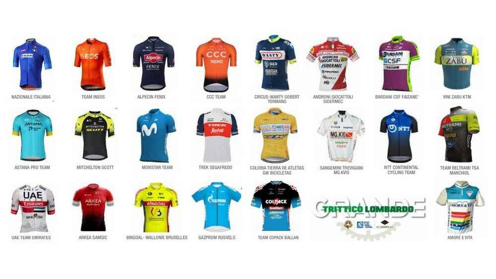 LE PARTECIPANTI Oltre alla nazionale italiana, al via del Grande Trittico Lombardo ci saranno Team Ineos, Alpecin Fenix, CCC Team, Astana Pro Team, Mitchelton Scott, Movistar Team, Trek Segafredo, Uae Team Emirates, Arkea Samsic, Bingoal Wallonie Bruxelles, Gazprom Rusvelo, Circus Vanity Goberttormans, Androni Giocattoli Sidermec, Bardani CSF Faizanè, Vini Zabu KTM, Colombia Terra de Atletas SGW, Sangemini Trevigiani MG.Kvis, NTT Continental Cycling Team, Team Beltrami Tsa Marchiol, Team Colpack Ballan, Amore e Vita.
