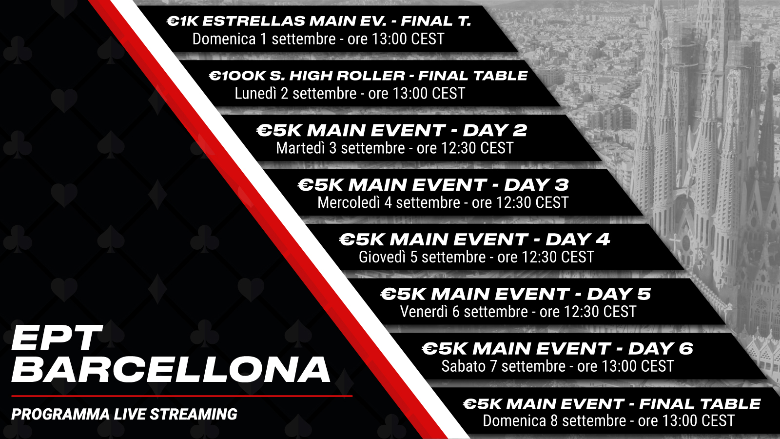 L’aspettativa è grande per ammirare in azione i più celebri professionisti del poker provenienti dall’Europa e dal resto del mondo. Per coloro che desiderano vedere i tornei dell’EPT, vi è un link per lo streaming in lingua italiana su questo sito: il Main Event, infatti, sarà trasmesso in diretta, gratuitamente e in italiano. Accedendo al player, gli spettatori avranno l’opportunità di assistere in tempo reale al rinomato torneo di poker che si tiene a Barcellona . Le narrazioni di Alberto Russo, Giada Fang e Pierpaolo Fabretti ci accompagneranno nell’esplorazione dei tornei che avranno luogo in terra catalana.