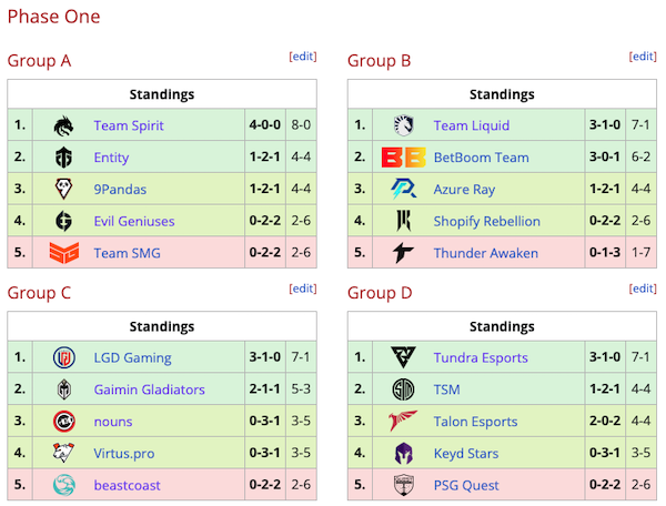 Dal Gruppo A si sono qualificati Team Spirit (campione nel 2021), Entity, 9Pandas ed Evil Geniuses. Eliminato il Team SMG, solo dopo spareggio con EG. Da notare che il Team Spirit, misto russo-ucraino e guidato dal Magomed “Collapse” Khalilov, è stato l’unico dell’intero Group Stage a non perdere nemmeno una partita.