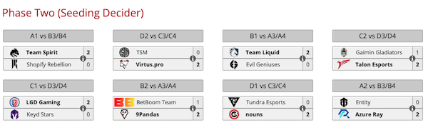 La fase 2 è un “seeding decider“, cioè un sistema per stabilire le posizioni nella fase 3. Le 16 squadre sono state abbinate in modalità incrociata, cioè prime dei gironi vs quarte, seconde vs terze, e match Bo3.