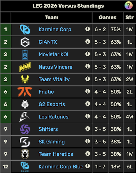 I G2, società più titolata a livello europeo insieme ai Fnatic, sono partiti male. Caps & friends hanno sofferto il nuovo formato, concedendo un punto proprio agli esordienti Los Ratones. Questi ultimi si trovano adesso a quota 4-4, lo stesso score di G2 e Fnatic. In negativo le altre quattro, soprattutto Karmine Corp Blu che ha vinto solo una partita a danno dei Los Ratones. Nei Karmine Corp Blu milita il toplaner italiano Alessandro Xu Hongtao.