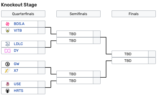 Come si vede dallo schema riportato, la parte alta del tabellone ha allineato 3 formazioni francesi. Il derby transalpino tra BDS Academy e Vitality Bee si è concluso nettamente a favore dei primi: 3-0. Stesso risultato tra LDLC Olympique Lyonnaise e gli islandesi del team Dusty a favore dei primi che hanno così creato le condizioni affinché un team francese fosse già matematicamente in finale. La semifinale tra BDS e LDLC è stata invece tiratissima: 3-2 finale per l’Academy del team pro BDS che ha così conquistato il primo slot per la finalissima.