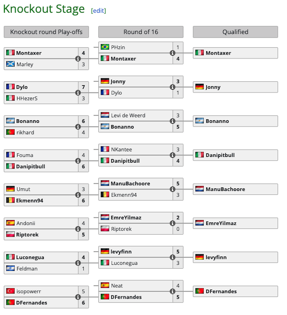 Al termine del Group Stage, Lucio “HezerS” Vecchione (campione italiano in carica), lo juventino Danipitbull, Luca “Luconegua” Guarino (Torino) e Montaxer si sono qualificati per la fase ad eliminazione diretta.