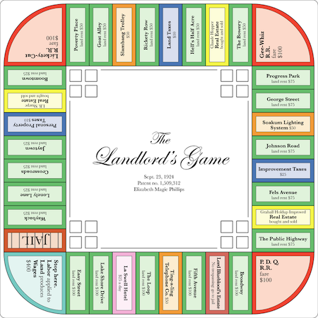 L’antesignano del Monopoly è un gioco creato nel 1903 da Elizabeth Magie e chiamato The Landlord’s Game. La cosa curiosa è che l’inventrice seguiva le idee dell’economista Henry George il quale sosteneva che tutto ciò che si trova in natura, principalmente la terra, appartiene all’intera umanità. Il gioco della Magie, dunque, sarebbe una sorta di critica al sistema del monopolio e alla concentrazione della ricchezza in poche mani (due, quelle del vincitore).