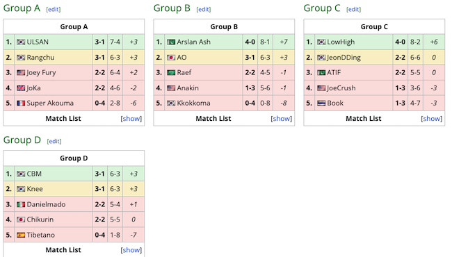 Gli 8 qualificati hanno dato vita a un tabellone double-elimination, formato da 6 players sudcoreani, un giapponese e un pakistano.
