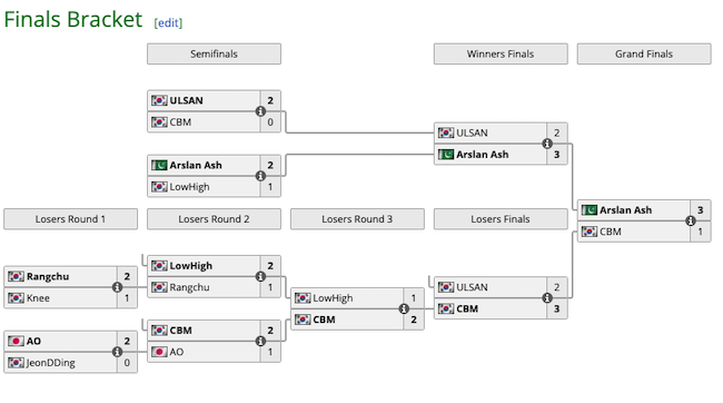 Nella parte del tabellone, riservata ai 4 vincitori dei gruppi, Arslan Siddique ha battuto 2-1 LowHigh nel primo round e 3-2 ULSAN nel secondo. Raggiunta la finale per il titolo, il campione Pakistano ha dovuto attendere il vincitore del Loser Bracket.