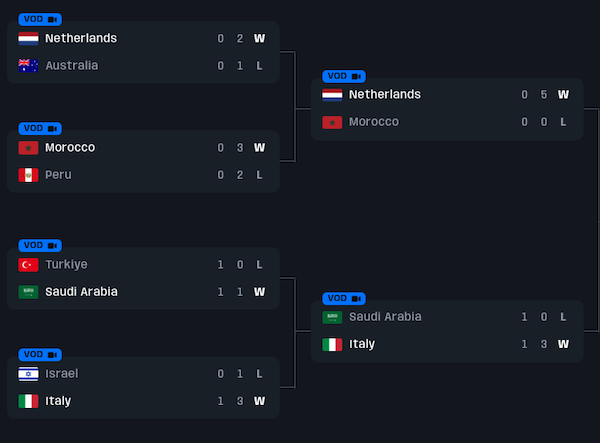 Oltre ad essere “i padroni di casa”, i sauditi possono contare sulla coppia del Team Falcons formata dal campionissimo – anche se ormai veterano – Musaad “Msdossary” Aldossary e da “GoatMoh“. Sono proprio questi ultimi a sbloccare il risultato nella prima partita con un gran gol di Mbappé che, servito in area, stoppa la palla e insacca in mezza girata. L’Arabia Saudita riesce poi a imbrigliare l’azione italiana, fino all’84° quando R9 insacca con un gran tiro in corsa. Finisce 1-1 e l’azione si sposta alla partita di ritorno. La gara rimane in bilico per 45 minuti, poi arriva il gol dell’Italia su un classico contropiede. A quel punto saltano gli schemi e gli azzurri dilagano. Finisce 3-0 per l’Italia che raggiunge le semifinali.