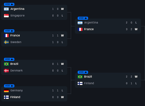 L’Argentina, dopo aver superato di misura (0-0 1-0) Singapore, sfida la Francia. Il team francese, che schiera “LJR_Peixoto” e Julien “Fouma” Perbal, è reduce dal durissimo ottavo contro la Svezia di “oliboli” e “opTolle“, terminato con il punteggio di 1-1 1-0 per i francesi. Ma contro gli argentini “Matiasbonanno9” e “nicolas99fc” (poi rimpiazzato da “Ezecorrea1802”), i galletti recuperano le energia necessarie per vincere entrambi gli scontri: 3-2 e 2-0 il punteggio che manda la Francia in semifinale.