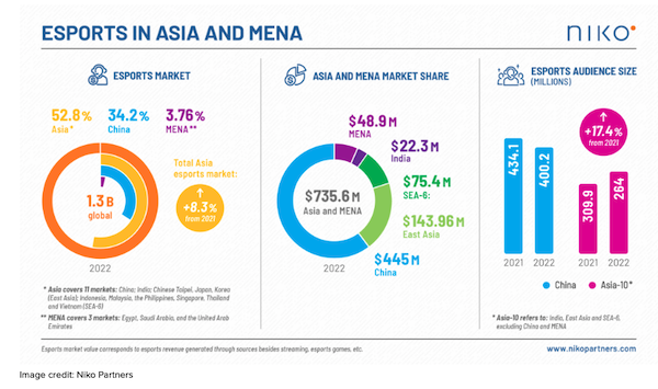Tutto questo nonostante la Cina abbia registrato un 7,8% in meno di pubblico rispetto all’anno precedente. A sostegno dell’area ci sono però stati aumenti di visualizzazioni negli altri mercati asiatici: in particolare in India, poi Giappone e Sud-est asiatico (SEA). Sempre secondo la ricerca di Niko Partners, il pubblico degli eSports che va dal Nord Africa all’Estremo Oriente conta 742 milioni di persone, 400 milioni solo in Cina.