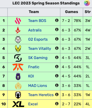 I Fnatic si qualificano insieme a SK Gaming e KOI, tutti a quota 4-5. I secondi hanno deluso parecchio dopo il terzo posto al Winter Split. La delusione maggiore è però rappresentata dai Mad Lions che hanno staccato l’ultimo ticket utile solo dopo la spareggio con il Team Heretics guidato da Jankos.