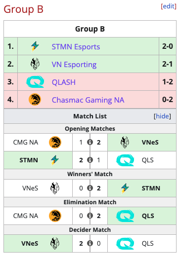 Inserito nel Gruppo B in compagnia di STMN Esports (Messico/Nordamerica Ovest), VN Esporting (Regno Unito/EMEA), Chasmac Gaming NA (USA/Nordamerica Est), QLASH ha perso 1-2 la prima sfida contro STMN.