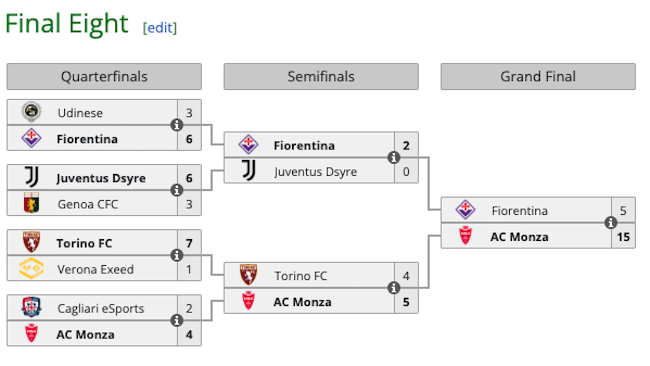 Nella finale per il titolo, però, Lucio “HhezerS” Vecchione ha messo davanti a Virgil una perfomance impressionante. Il match di andata si è concluso 9-3 a favore del Monza. Il ritorno è stato solo poco meno pesante per i viola: 6-2, per un risultato aggregato che vede il Monza battere la Fiorentina 15 – 5.