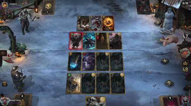 Tornando alle abilità, ce ne sono alcune che modificano il valore di forza delle proprie unità, altre che penalizzano quelle nemiche. In Gwent la chiave sono proprio i punti forza: vince chi alla fine del round ne ha totalizzati di più. Un round termina in caso di esaurimento di carte nella mano di uno dei due giocatori: a quel punto si passa al conteggio dei punti e poi le carte rimaste in campo vengono collocate nel “cimitero”.
