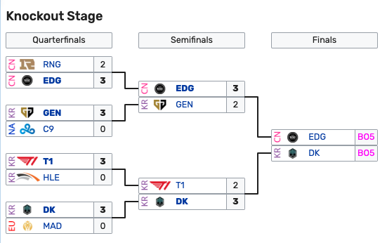 A dare vita alle semifinali sono dunque arrivate tre formazioni sudcoreane (Gen.G, T1 e Damwon) e una cinese (EDG).