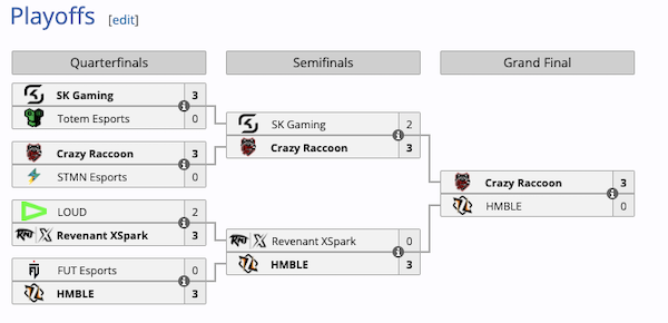Ed eccoci alle semifinali. Molto bella e intesa quella tra SK Gaming e Crazy Racoon. La formazione europea ha avuto un match point, bloccato però dal team giapponese che ha poi chiuso il conto nella quinta e ultima partita (2-3). Molto più semplice la vittoria di HMBLE su Papara Supermassive: punteggio 3-0.
