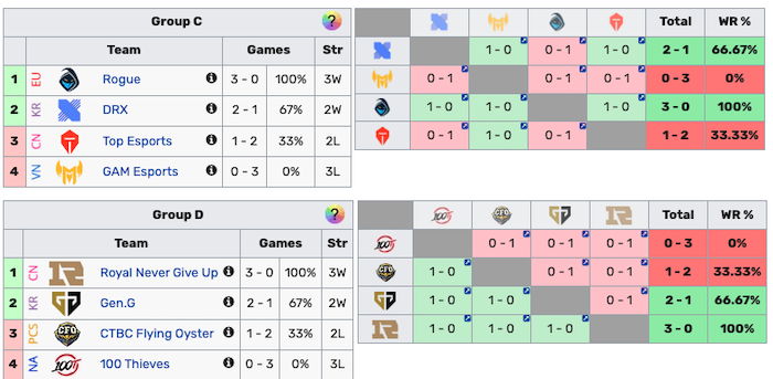 Dando per quasi certa la qualificazione al Knockout Stage dei Rogue, il secondo ticket disponibile diventa un affare tra i sudcoreani DRX e i cinesi di Top Esports. I primi sono avanti 2-1 vs 1-2, ma lo scontro diretto rimane molto aperto.