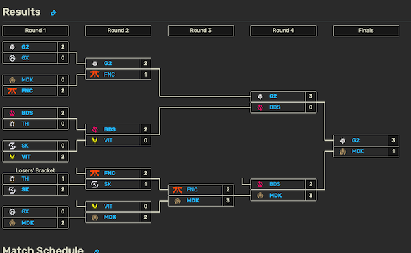 Il club spagnolo è partito con il turbo inserito e ha vinto il primo game. I G2 hanno però dimostrato di essere ancora uno step avanti a tutti, nonostante la resistenza dei Mad Lions KOI. Il quarto e decisivo match (33 minuti la durata) è stato combattuto fino alla fine, quando i G2 hanno chiuso il conto in un “royal rumble” che ha spazzato gli avversari.