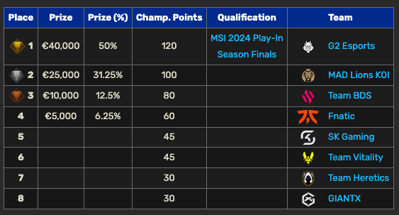 Oltre al titolo, l’organizzazione con sede in Germania ha incassato 40mila euro di premio, la qualificazione diretta al Play-In del Mid Season Invitational e 120 punti utili per la qualificazione alle Season Finals.