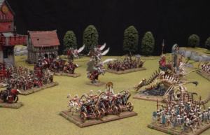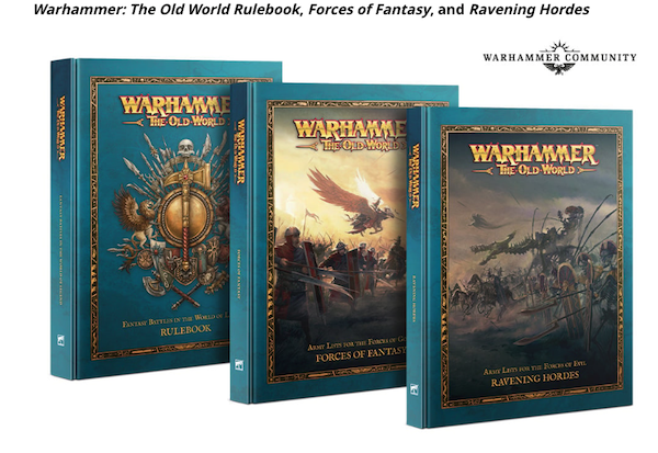 Mancano invece i libri specifici degli eserciti che vanno acquistati separatamente. In questo caso, GW ha avuto l’ottima idea di pubblicarne solo due: quello delle Forces of Fantasy, cioè del “Bene” (Nani, Bretonnia, Impero degli uomini, Elfi Alti ed Elfi Silvani), e quello delle Ravening Hordes che rappresentano il “Male” (Orchi e Goblin, Guerrieri del Caos, Uominibestia e Re dei Sepolcri).