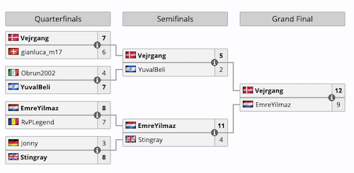 L’ultimo atto dell’UEFA eEURO 2025 ha visto i last 8 sfidarsi offline a Londra in un tabellone singolo ad eliminazione diretta. Francesco Tagliefierro si è arreso nel primo round con il punteggio di 4-7 a YuvalBeli, a sua volta eliminato da Vejrgang in semifinale. Nella parte bassa del tabellone Yilmaz ha superato RvP Legend e Stingray, per poi essere sconfitto 9-12 da Vejrgang in finale: il danese ha così conquistato il trofeo e $30.000 di primo premio.