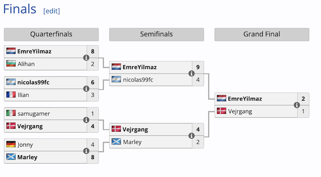 L’exploit – ma attenzione perché Marley è davvero in forma! – dello scozzese è finito alla semifinali, dove Vejrgang si è imposto per 4-2. Nella parte alta del tabellone, invece, tutto è stato sorprendentemente facile con EmreYilmaz che schiaccia nicolas99fc sotto un pesante 9-4 finale, dominando per tutta la partita.