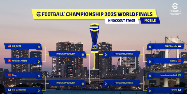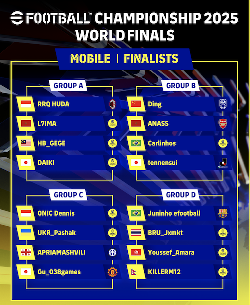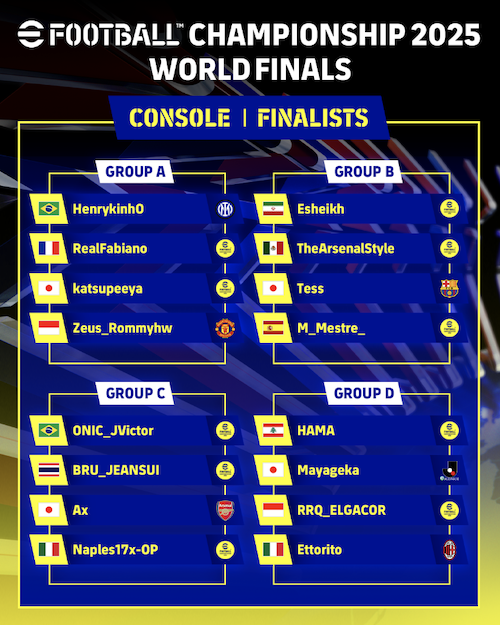 Dal Gruppo A si sono qualificati HB_GEGE (Malesia, 9 punti) e il giapponese DAIKI (6). Dal B il cinese Ding (5) e il marocchino ANASS (5), grazie alla differenza reti sul giapponese tennensui. Il C ha promosso il player indonesiano ONIC Dennis e il veterano nipponico Gu_038games, runner-up lo scorso anno alle spalle del brasiliano Rentao. 6 punti per entrambi, e 6 anche per il giovanissimo ucraino UKR_Pashak, eliminato dalla diferenza reti. Infine, Juninho efootball (Brasile, 5) e il turco Youssef_Amara (5), qualificati dal Gruppo D.