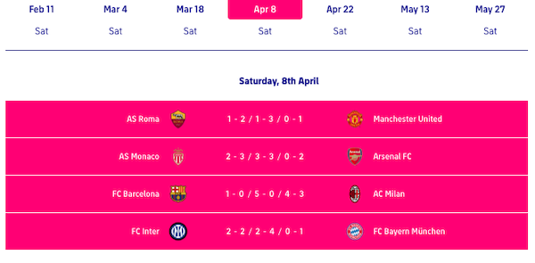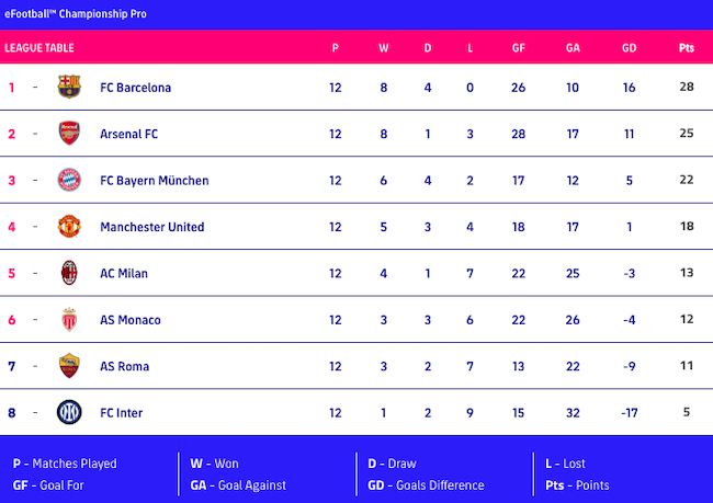 L’ultima sfida ha messo di fronte il club francese AS Monaco e gli inglesi dell’Arsenal. Partita delicata rispettivamente tra chi è in cerca di punti per staccarsi dalla “zona calda” e chi invece insegue il Barcelona capolista. E’ andata meglio ai secondi, cioè l’Arsenal che ha conquisto 7 punti sul 9, grazie alle vittorie di “Indominator47“ su “Usmakabyle” (3-2) e del campione europeo in carica nonché ex-romanista Marko “Roksa22” Roksic su “Kams10” (2-0). L’unico punto dei francesi arriva da “Zilo” che ha pareggiato 3-3 con “Ostrybuch”.