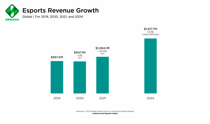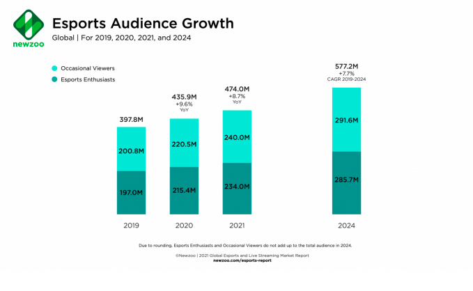 La previsione per il futuro degli eSports è rosea al punto che Newzoo prevede, per i prossimi quattro anni, un tasso di crescita annuale del 7,7% per quanto riguarda i consumatori globali di eSports, ovvero 577,2 milioni di persone entro la fine del 2024.