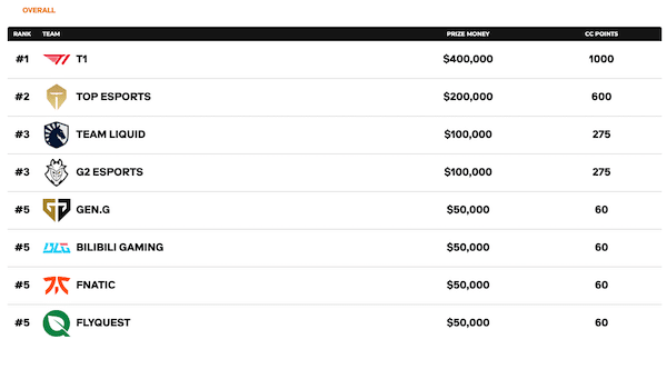 Il secondo titolo assegnato riguarda invece il MOBA prodotto da Riot Games. Al torneo di League of Legends hanno preso parte 8 team, 2 per ciascuna delle area geografiche più competitive: Gen.G e T1 (LCK-Corea del Sud), Bilibili Gaming e Top Esports (LPL-Cina), G2 Esports e Fnatic (LEC-Europe/Middle East/Africa), Team Liquid e FlyQuest (LCS-Nordamerica).