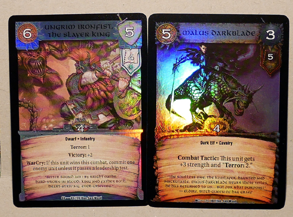 Fra le forze del Bene c’erano carte di Imperiali, Elfi Alti e Nani. Il male metteva a disposizione Caos, Orchi e Goblin, Elfi Oscuri. Inoltre, a differenza di Warhammer 40.000 che distingueva in carte unità, personaggio e fortificazioni, in questo caso i giocatori avevano unità, incantesimi e oggetti magici.