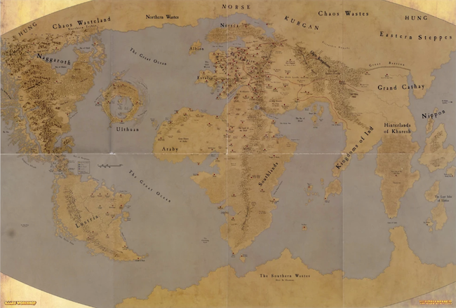 Il Cathay è infatti governato dall’immortale Imperatore-Dragone Celestiale Xen Yang, che regna da oltre cinquemila anni su una delle aree più orientali del mondo fantasy creato da GW. A questo proposito, vale la pena ricordare che se l’ispirazione del gioco è tolkeniana, la geografia imita quella del mondo reale, con le Americhe a Ovest, Europa e Africa al centro e il continente asiatico a Est. In mezzo all'”Oceano Atlantico”, spunta un’isola-continente (Ulthuan) che potrebbe rappresentare Atlantide. Tutto diventa più chiaro osservando la mappa qui sotto (credits Warhammer wiki):