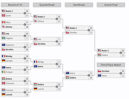 Alle fine si è imposto lo statunitense Radu “Radu C” Casapu, del team Thai Rock Readers. Nella finalissima, lo statunitense ha battuto 3-2 l’ungherese Szabolcs “Debre” Debre (Team Krai Babies). Il montepremi di $108.470 ha consegnato al primo $48.470 dollari e 20milla al runner-up. Bronzo ($10k) per il polacco “Strefan” vincitore della finalina sull’australiano ($6k) Joseph “Leero” Gansemer. Anche gli esporters hanno ricevuto un premio in denaro: $3.000 per gli eliminati ai quarti di finali e 1500 ai restanti.