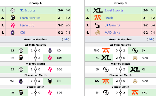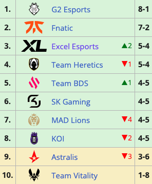 La Regular Season si è conclusa con 8 team qualificati alla seconda fase. Oltre ai G2 e ai Mad Lions, hanno trovato il pass anche BDS, Fnatic, Team Heretics, SK Gaming, KOI e Excel Esports. La performance (5-4) di questi ultimi merita di essere sottolineata dal momento che l’organizzazione britannica aveva sempre stentato in questa stagione, ma l’innesto a maggio del jungler sudcoreano Lee “Peach” Min-gyu ha senza dubbio dato una marcia in più al team.