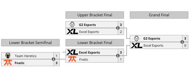 I Playoffs hanno regalato le sfide più belle del torneo. Su tutte quella tra G2 Esports e Excel Esports, l’unica davvero sofferta per il team formato da Caps, Hans Sama, Brokenblade, Mikyx e Yike. Nel Bo5, i G2 sono andati in vantaggio due volte ma gli Excel hanno sempre recuperato. Sul 2-2 le squadre hanno offerto uno spettacolo emozionante, con un match tiratissimo durato quasi 40 minuti di gioco che si è concluso con la vittoria di G2.