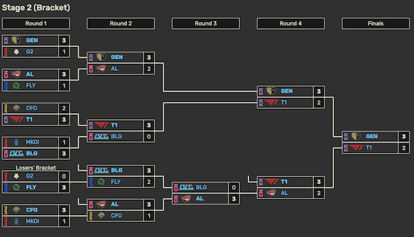 Nel Bracket con doppio tabellone, i team di Cina e Corea del Sud hanno raggiunto le semifinali. Gen.G ha battuto 3-2 Anyone’s Legend, mentre i T1 del GOAT Faker hanno spazzato via Bilibili con un secco 3-0. Gen.G ha poi sconfitto T1 nella prima finale con il punteggio di 3-2.